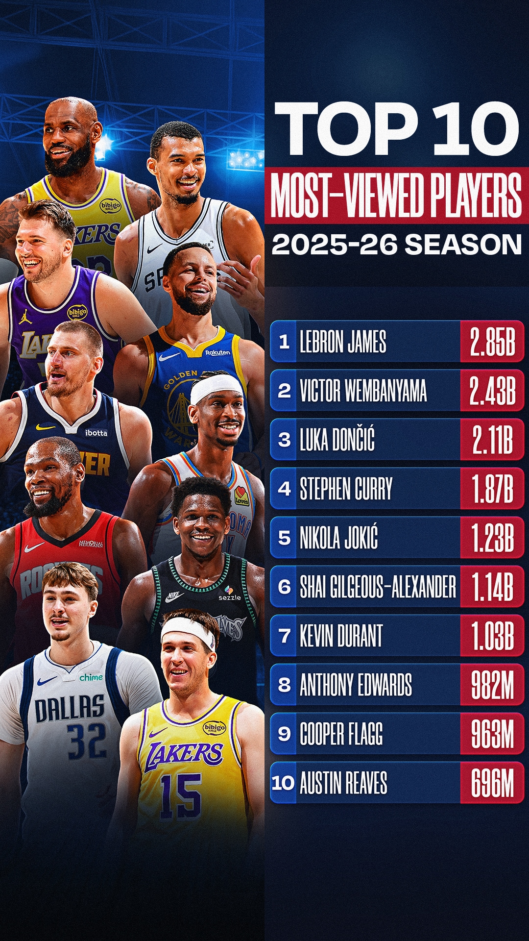 Spurs superstar Victor Wembanyama finished second at 2.43 billion views, followed by LeBron’s teammate Luka Dončić at 2.11 billion views.