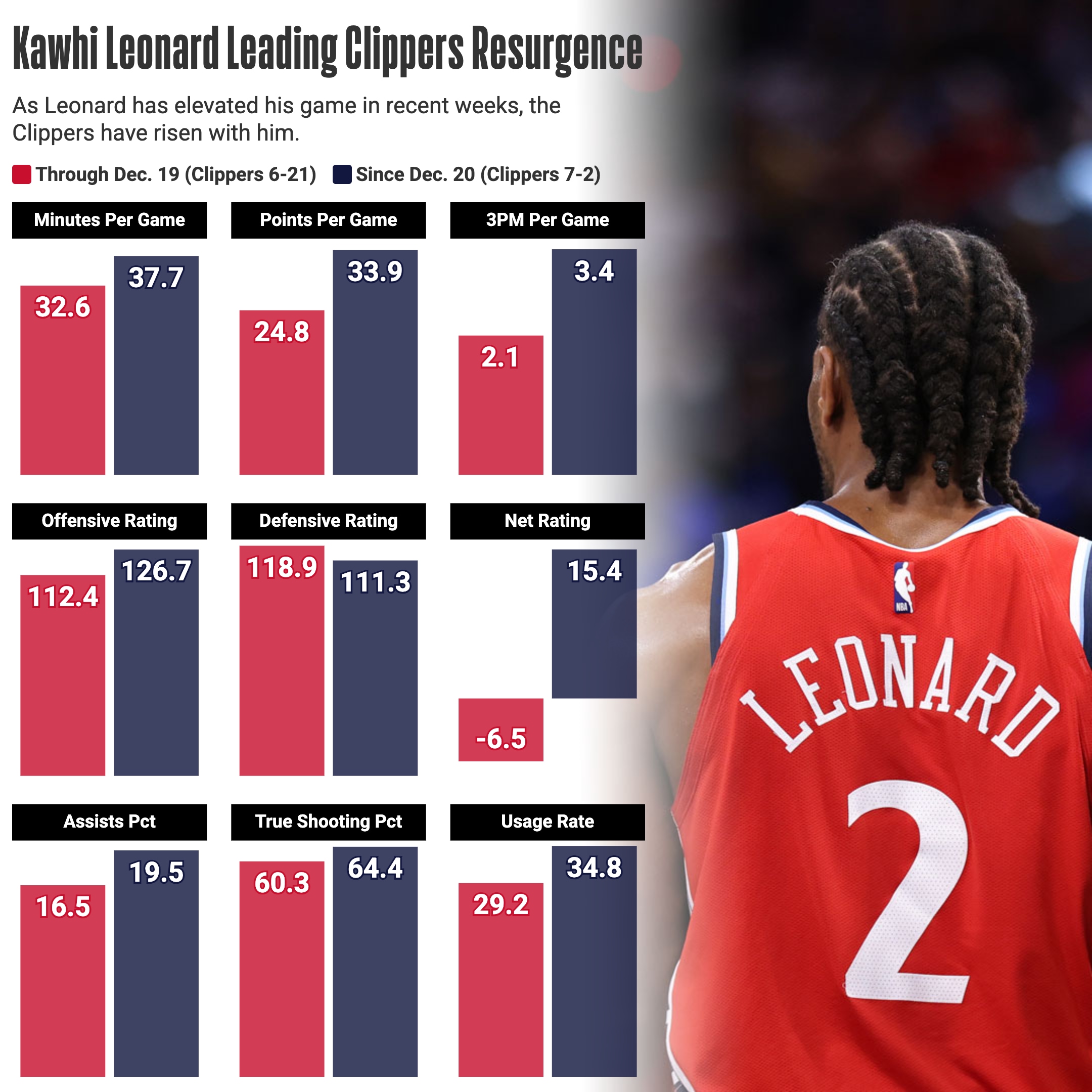 At the center of this resurgence is Leonard, who has averaged a league-high 33.9 points, along with 7.7 rebounds, four assists and 3.4 3-pointers per game. He’s also shooting 49.8% overall, 37.8% on 3-pointers and 93.5% on free throws in the past nine games.