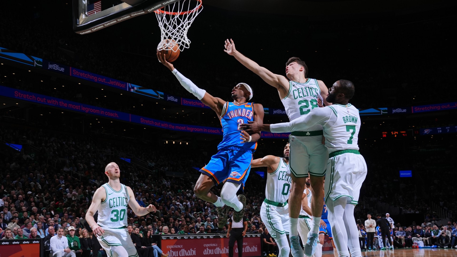 The Celtics and Thunder are locked in a close game at the half. Oklahoma City leads 53-49, and Shai Gilgeous-Alexander has 12 points on 5-for-6 shooting.