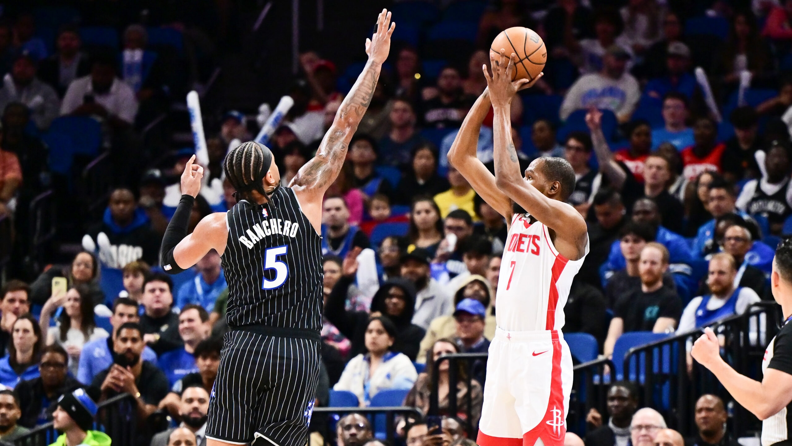 ORLANDO, FLORIDA – FEBRUARY 26: Kevin Durant #7 of the Houston Rockets shoots over Paolo Banchero #5 of the Orlando Magic