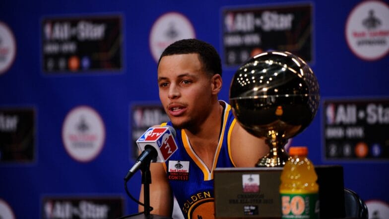 Stephen Curry of the Golden State Warriors talks to the media after the 3-Point Contest in the 2015 NBA All-Star in Brooklyn, New York.