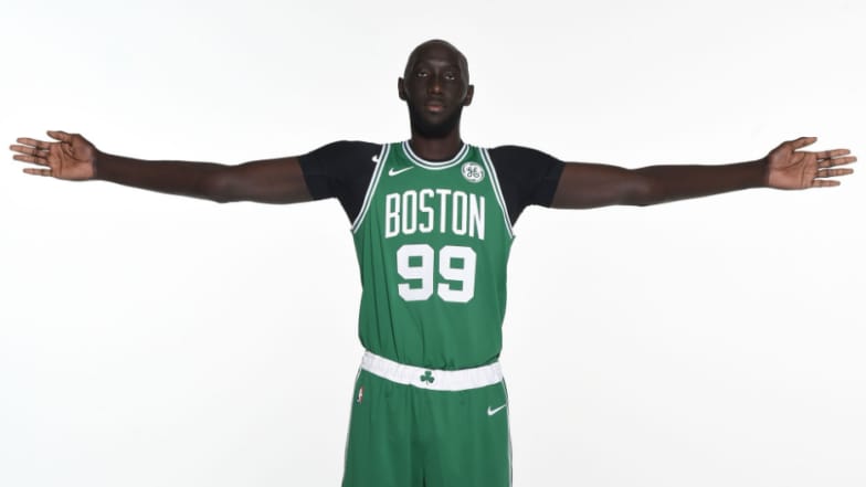 Tacko Fall showcased his 8-ft, 2.25-in wingspan at Boston Celtics Media Day in 2019.