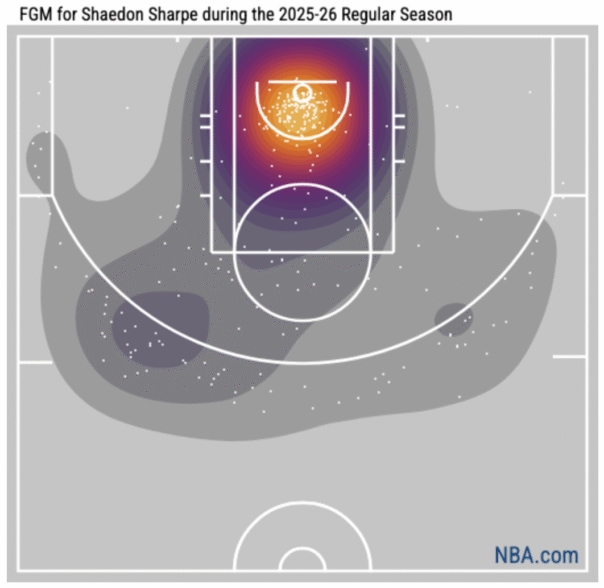 Sharpe is averaging 21.8 points per game this season, up from 18.5 ppg in 2024-25, and the biggest difference is how he’s getting his buckets. Earlier versions of Sharpe could drift into tougher shots, where his jumper was the escape when things got messy. He’s been more direct this season, taking shots at the rim (32% of his shots have come from the restricted area) while forcing defenders to make decisions.