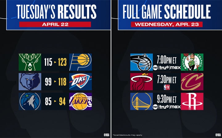 The action opens with the top two seeds in the East seeking 2-0 leads as the Celtics host the Magic (7 ET, TNT) and the Cavs welcome the Heat (7:30 ET, NBA TV). The nightcap shifts West with the Rockets seeking a split with the visiting Warriors (9:30 ET, TNT).