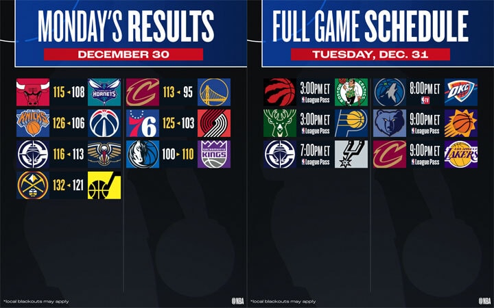 NBA x NYE: Spend the final night of 2024 with a six-game slate, led by an NBA TV matchup between the Thunder and Wolves (8 ET) as OKC goes for its 12th straight win to close out the year.