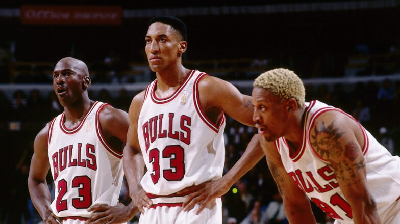 Michael Jordan, Scottie Pippen e Dennis Rodman conquistaram três títulos consecutivos com o Chicago Bulls entre 1996 e 1998.